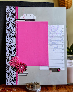 I used an American Crafts black cloth covered 3 ring binder with 20 8 1/2 by 11 pages protectors. This one also has a photo frame on the front cover for a 4 x 5 picture - I think. You may have counted the layouts and yes there are only 16, I did this on purpose because I wanted Tami to have a couple of blank spots to insert dance schedules and awards and maybe a couple of extra large photos so that all the details in her daughter's dress(es) wouldn't go unnoticed. The paper packs I used were Posh from Teresa Collins and also the Be Mine by Echo Park Paper Co. I have used lots and lots of other products throughout and although I wish I had now, I did not at the time keep track of everything...so unfortunately I can not give you any more details or brand names other than what I've already listed - I apologize. What I can tell you however is that this album is super interactive. I have added everything that I could think to add in. There are tags that pull out, there are some that tuck in, there is a mini book that has several pages for journaling, there is a photo frame for 'the' picture to be added, there's even one photo mat that has a ribbon that can be tied around it, and there is an entire page that has a 'top 10' to fill in, I even added a zipper that actually functions.